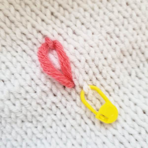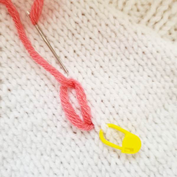 Markiere mit einem Maschenmarker die Mitte der Blume auf dem Kardigan. So bleiben alle Blütenblätter gleichmäßig.